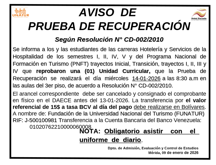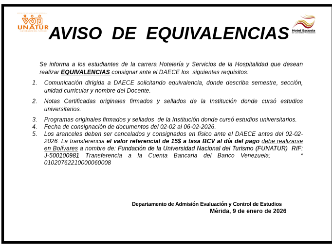 Desde UNATUR Núcleo Hotel Escuela de Los Andes Venezolanos celebramos el inicio de un nuevo año académico y les informamos sobre inscripciones para estudiantes regulares en el período I-2026.